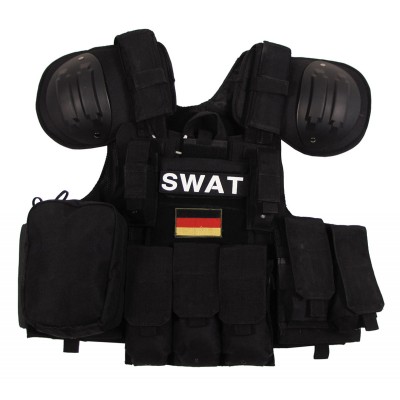 taktische Weste mit Abwurfsystem mit abklettbarem Schulterschutz Rettungsgriff mit Klettsicherung große Mehrzwecktasche mit Reißverschluss .2 Pistolenmagazintaschen mit Platte und Klett,Doppeltasche mit Platte und Klett,3-fach Tasche mit Platte und Klett,1 Funkgerätetasche